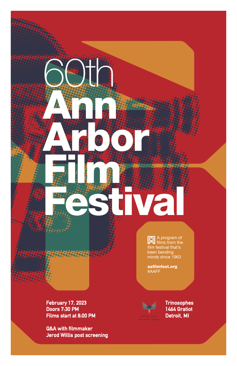 After a long hiatus, we are so very excited to present a program of amazing films to you all! Please join us in person at Trinosophes on Friday, Feb 17th for a selection of award-winning films from the 60th Ann Arbor Film Festival.The 70-min program includes films from Austria, Germany, Taiwan, the UK, California, North Carolina, and Michigan! Stick around after the screening for a Q&A with filmmaker Jerod Willis and if you like what you see, mark your calendars to catch more mind-bending films at the upcoming 61st Ann Arbor Film Festival, in-person March 21-26 (and online through March 29).